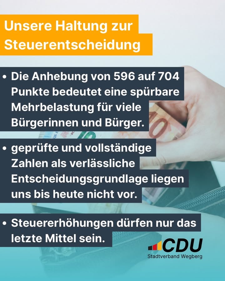 In der gestrigen Ratssitzung haben wir gegen die Erhöhung der Grundsteuer von 596 auf 704 gestimmt. Wir sind überzeugt, dass eine zusätzliche finanzielle Belastung für viele Bürgerinnen und Bürger gut begründet und nachvollziehbar sein muss. Eine Steuererhöhung wollten wir zum jetzigen Zeitpunkt nicht mittragen. Leider waren wir die einzige Fraktion, die gegen diesen Schritt gestimmt hat, sodass wir die Entscheidung nicht verhindern konnten.Für eine so weitreichende Entscheidung fehlten aus unserer Sicht wichtige Grundlagen. Der aktuelle Haushalt ist von großen Unsicherheiten geprägt. Bis heute liegt kein vollständig geprüfter Jahresabschluss vor, ebenso wenig belastbare Prognosen für die kommenden Jahre. Das bedeutet ganz einfach: Niemand kann derzeit verlässlich sagen, wie viel Geld der Stadt in den nächsten Jahren tatsächlich zur Verfügung steht und wie sich Einnahmen und Ausgaben entwickeln werden.Ohne diese Klarheit halten wir es für falsch, Wegbergs Bürgerinnen und Bürger stärker zur Kasse zu bitten. Wir setzen uns für Transparenz, verlässliche Zahlen und ausreichend Zeit für eine sorgfältige Entscheidungsfindung ein. Steuererhöhungen dürfen aus unserer Sicht immer nur der letzte Schritt sein. Unser Anspruch bleibt eine verantwortungsvolle und nachvollziehbare Finanzpolitik für unsere Stadt.#cduwegberg #wegberg