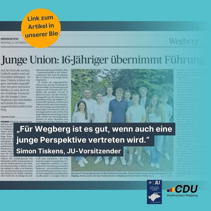 mehrErinnert ihr euch noch an die Neuwahl des JU-Vorstandes in Wegberg?Die Junge Union Wegberg ist die einzige politische Jugendorganisation in unserer Stadt ? und ja, da sind wir als CDU schon ein bisschen stolz drauf. 😉Umso mehr freut es uns, dass sich engagierte junge Menschen finden, die die junge Perspektive für Wegberg vertreten und mit frischen Ideen anpacken.Die Rheinische Post hat die JU besucht und einen tollen Artikel darüber geschrieben! 👉 Den Link dazu findet ihr wie immer in unserer Bio.#cduwegberg #juwegberg #jungeunion #wegberg #politikvorort #jugendengagiert #zukunftgestalten #teamcduwegberg